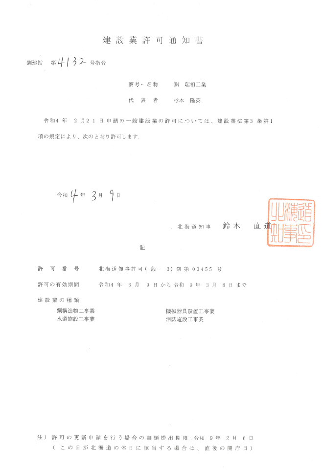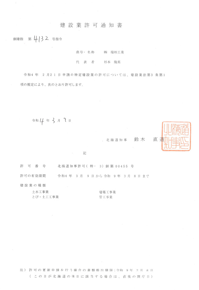 | 許可番号 | 特定建設業 北海道知事許可(特-3) 釧第 00455号 |